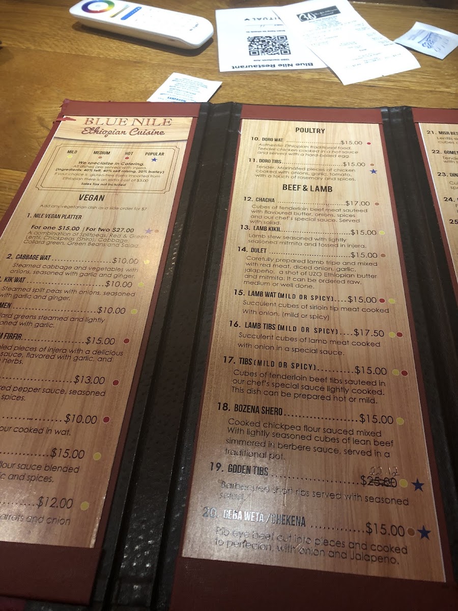 The menu at Blue Nile Restaurant offers a diverse range of flavorful dishes, catering to various dietary preferences. For vegan options, you can enjoy dishes like the NILE VEGAN PLATTER For 2, which includes a selection of plant-based delights such as Cabbage, Kale with SheroKik Wet, and Gomen. Fish lovers can indulge in Asa Tibs or Asa Gulash, while poultry enthusiasts can savor the traditional Doro Wet or Doro Tibs. For beef dishes, options like Dinich Besiga (Potatoes + Beef), Cornis Regular Tibs, and the hearty Beef Couscous Kitfo are available. If you're in the mood for variety, the MEAT COMBINATION For 1 or MEAT COMBINATION For 2 provide a generous mix of flavors. To complement your meal, a variety of refreshing cold drinks are offered, including Club Soda, Perrier Water, Bottled Water, Nestea, and Coca-Cola. Whether you're seeking vegan, poultry, beef, or fish, Blue Nile Restaurant offers a satisfying and authentic experience for all tastes.